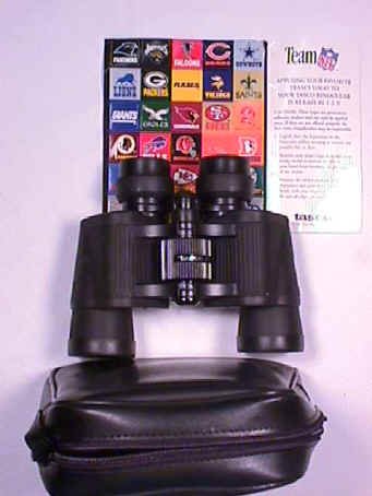 These 7x35 binoculars have special properties that make them greet for water-associated sports and outdoor fun. They're shock and moisture resistant, ideal for gripping even with wet hands. They won't slip on moisture-laden surfaces and their non-denting finish can take rough handling, shocks and bumps. With all of these qualities plus bright, clear images, they're a natural for a host of outdoor activities. Also included are NFL stickers to put on your binoculars to support you team. -Power: 7X-Objective Diameter: 35mm-Field of View @1000 Yards: 420'-Focus System: Zip-Prism Type: Porro-Other Features: Fully Coated, Eye Cups, Carrying Case and stapes-Length: 5 1/2"-Width: 7"-Weight: 1.5Pounds