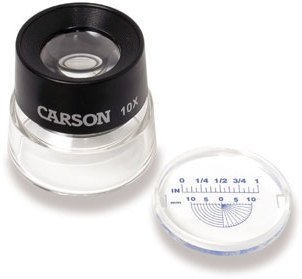The LL-20 LumiLoupe from Carson Optical is a 10x power stand Magnifier with pre-focused dual lenses. This Magnifier is ideal for close-up examination of objects, while its transparent acrylic base allows ambient light to illuminate the subject for bright, clear viewing. The snap-on reticle lets you make accurate measurements in both millimeters and inches.